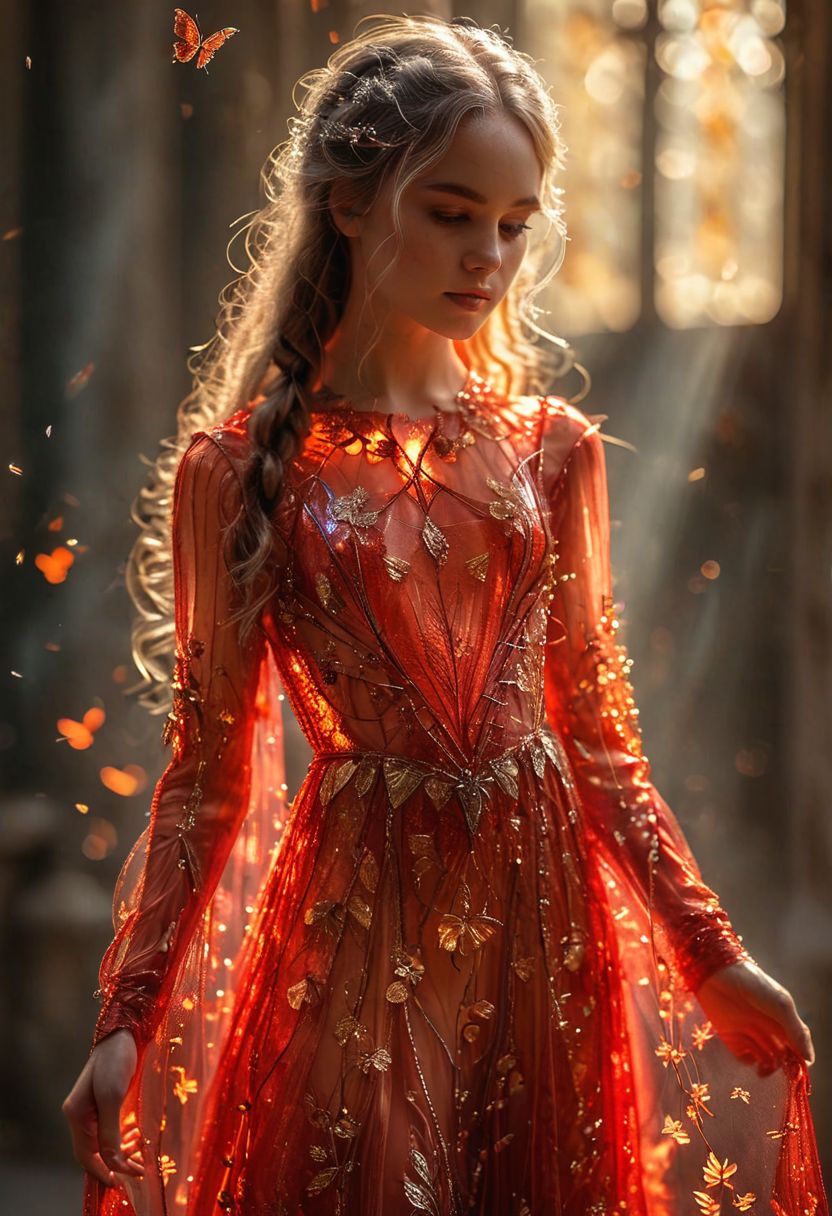 a beautiful 1girl in transparent red glass dress, with a exquisite fragile iridescent glass leafs, surrounded with [white:2] butterflies, intricate details, masterpiece, award winning, rich, breathtaking, golden hour light, bokeh, atmospheric,