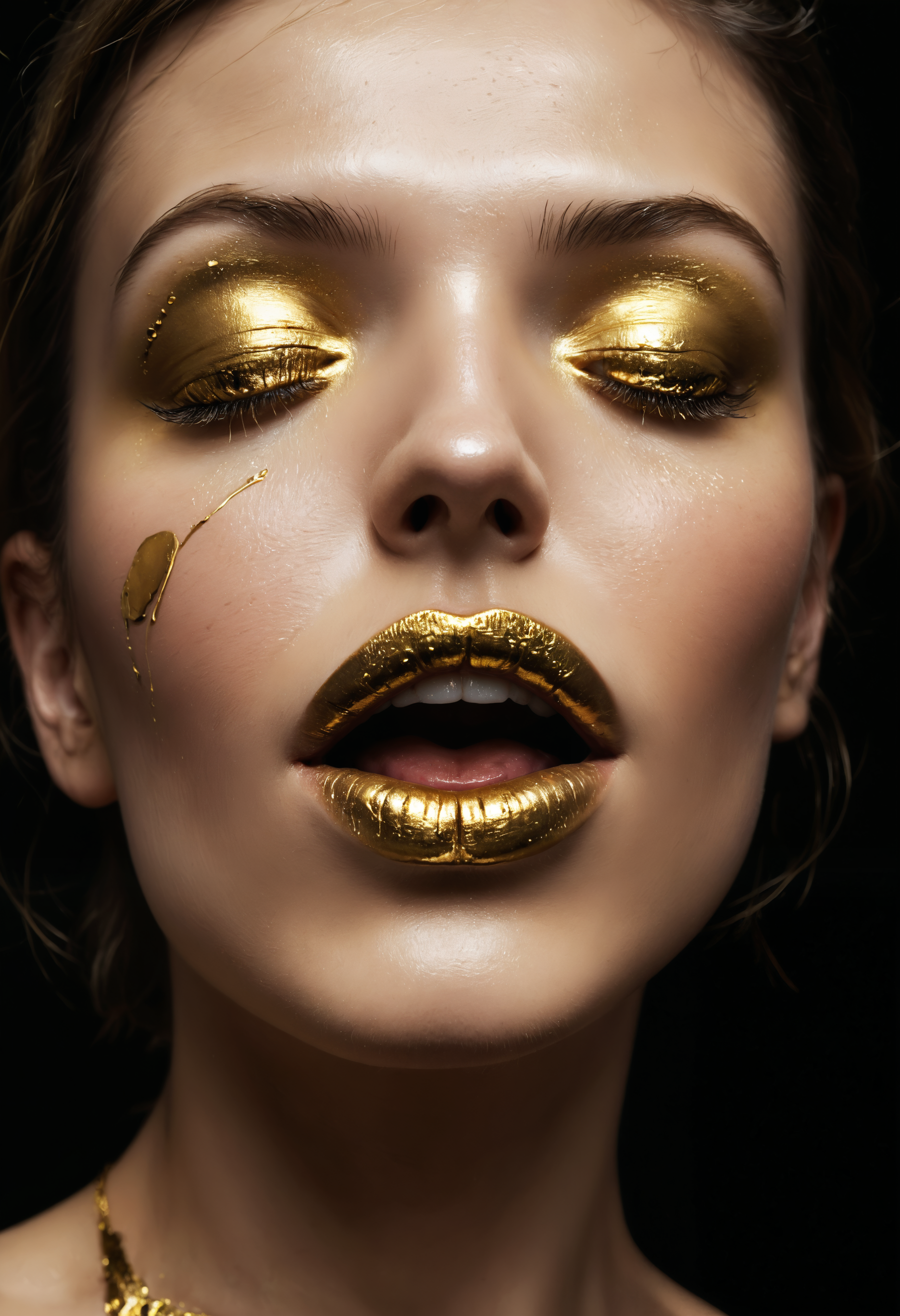 a portrait of a woman, golden make-up, closed eyes, beautiful face expressions