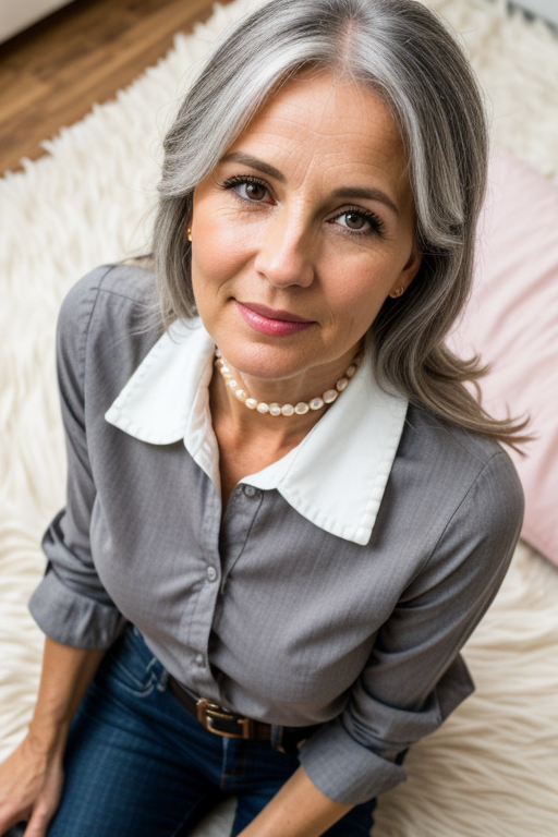 RAW photo, subject, 8k uhd, dslr, soft lighting, high quality, film grain, Fujifilm XT3, beautiful eyes, highly detailed eyes, realistic eyes, realistic face, highly detailed face, <lora:FDSkinDetails:0.6>, lora:more_details:0.5>, <lora:breastsizeslideroffset:0> picture from above,skinny, 59yo mature, woman, wrinkles, Long weavy Grey hair, kneeling on a white fluffy carpet, in the Living room, (blush:1.1), Looking at Viewer, wearing blouse with many Buttons opened, ceiling light, (wearing a big pearlcollar:1.4),