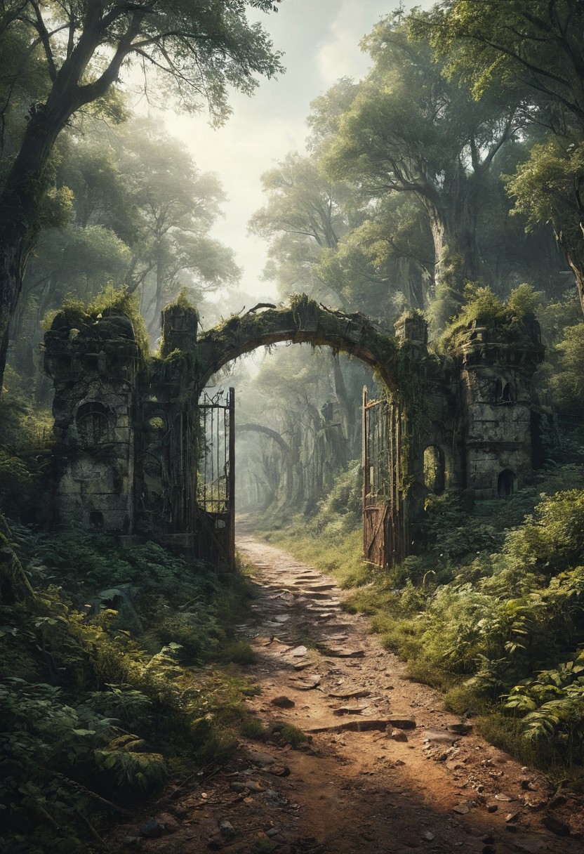 Fantasy ransacked palisade gate with structural damage in a forest with two dirt roads leading up to different villages behind it, digital art