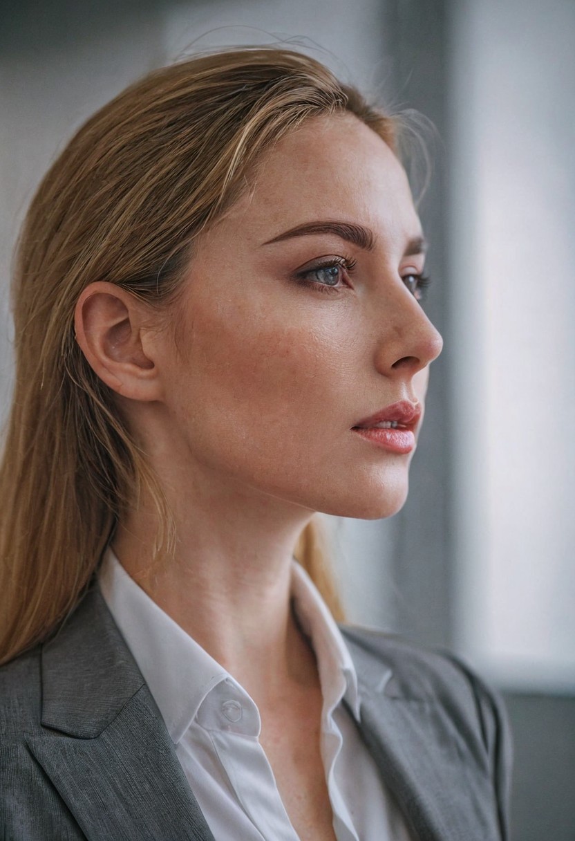 closeup photo of sensual East-European woman, cleavage, luxury office, early morning, (veins, skin pores, natural skin texture:0.55),