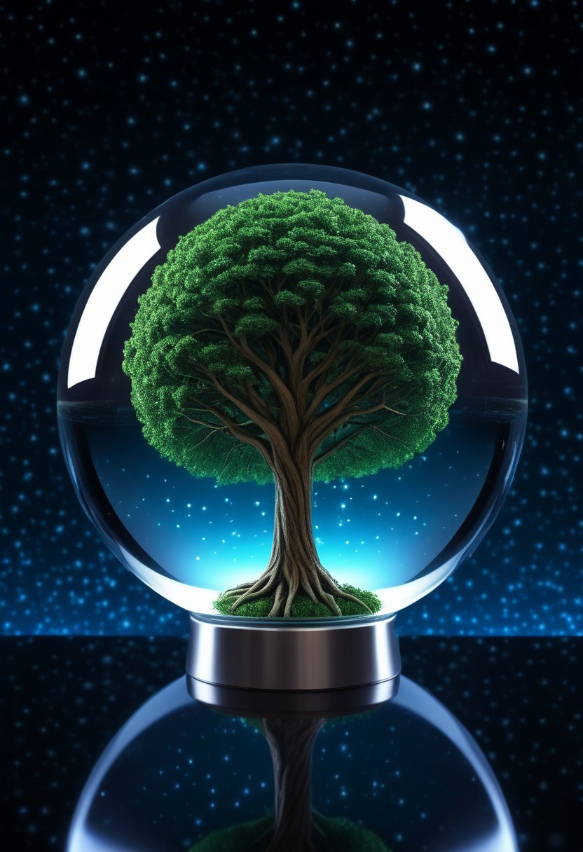 One Giant tree standing on the glowing small glass sphere like planet earth, no human, in space, starry sky, Radial starfield background,