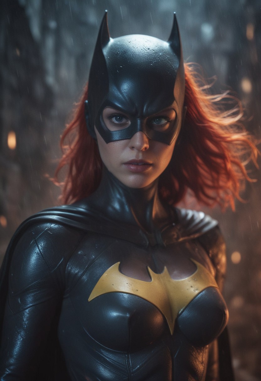 High resolution ultra-realistic of beautiful realistic Batgirl fighting against alien invasion, cinematic style, standing on a bloody and stormy battlefield in a fighting pose, bloody massacre, realistic modern combat costume, black mask, red cape, perfect athletic figure, wavy red hair, handsome dirty bloody face, beautiful perfect detailed pupils, wet oily shiny skin, covered in dirt and blood, beautiful firm Breasts, defiant and seductive, sexy 20 year old girl, 8k resolution concept art portrait by Greg Rutkowski, Dark Gotham City, realistic blue eyes, full body, Artgerm, WLOP, Alphonse Mucha, dynamic lighting, hyperdetailed, intricately detailed, Splash art trending on Artstation triadic colors, Unreal Engine, 5 volumetric lighting, Cinematic Lighting, intricate, smooth, sharp focus digital painting, Asymmetrical Balance, painting, dynamic lighting