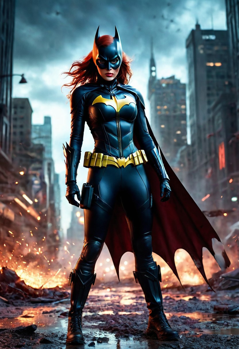 High resolution ultra-realistic of beautiful realistic Batgirl fighting against alien invasion, cinematic style, standing on a bloody and stormy battlefield in a fighting pose, bloody massacre, realistic modern combat costume, black mask, red cape, perfect athletic figure, wavy red hair, handsome dirty bloody face, beautiful perfect detailed pupils, wet oily shiny skin, covered in dirt and blood, beautiful firm Breasts, defiant and seductive, sexy 20 year old girl, 8k resolution concept art portrait by Greg Rutkowski, Dark Gotham City, realistic blue eyes, full body, Artgerm, WLOP, Alphonse Mucha, dynamic lighting, hyperdetailed, intricately detailed, Splash art trending on Artstation triadic colors, Unreal Engine, 5 volumetric lighting, Cinematic Lighting, intricate, smooth, sharp focus digital painting, Asymmetrical Balance, painting, dynamic lighting