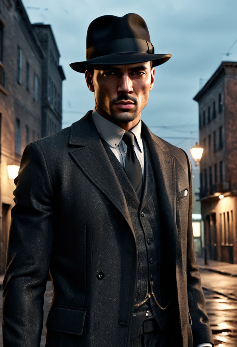 score_9, score_8_up, score_7_up, 8k, very detailed, high detailed texture, volumetric lighting, ultra detailed skin, very detailed realistic eyes, very detailed realistic face,, perfect anatomy, gangster dressed in an elegant black suit, typical of 1920s fashion. He wears a fedora hat tilted to one side, which partially hides his face. His eyes are focused and his expression is serious and determined. (In his right hand he holds a pistol, from which you can see the flash of the shot, illuminating his face with an intense glow: 1.4). The background is dark and hazy, with shadows adding an air of mystery and danger to the scene. The gangster is standing on a deserted street, with old buildings and streetlights that barely illuminate the surroundings, creating a tense and dramatic atmosphere.