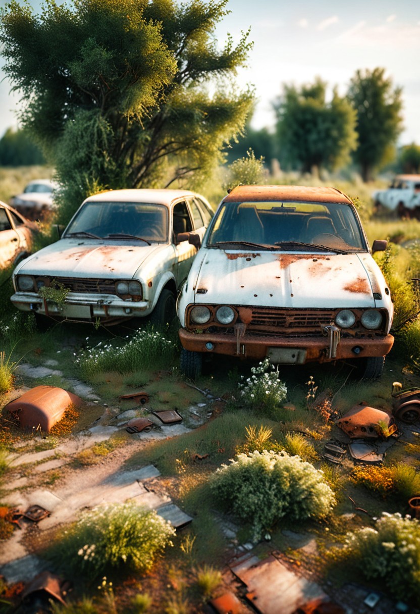 realistic, photograph, detailed photography, high quality, depth of field, tilt shift, white balance, volumetric lighting, Grass field, 2 rusty cars, bushes and tree growing out of the cars, post apocalyptic, dawn