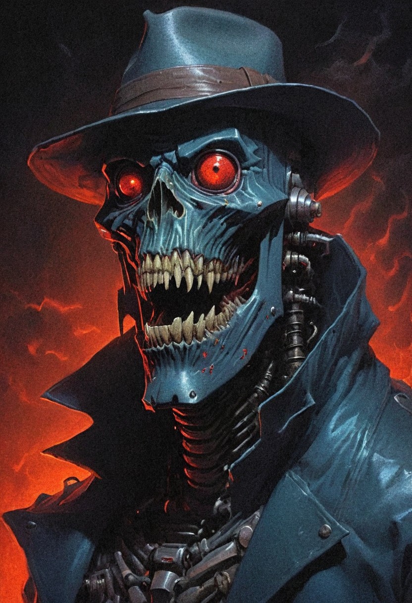 DnD_Grainyboyz, grainy, noise, Dark artwork of a human like robot, giant jaw, cold blue metal, big round glowing red eyes, wearing black fedora and detective coat