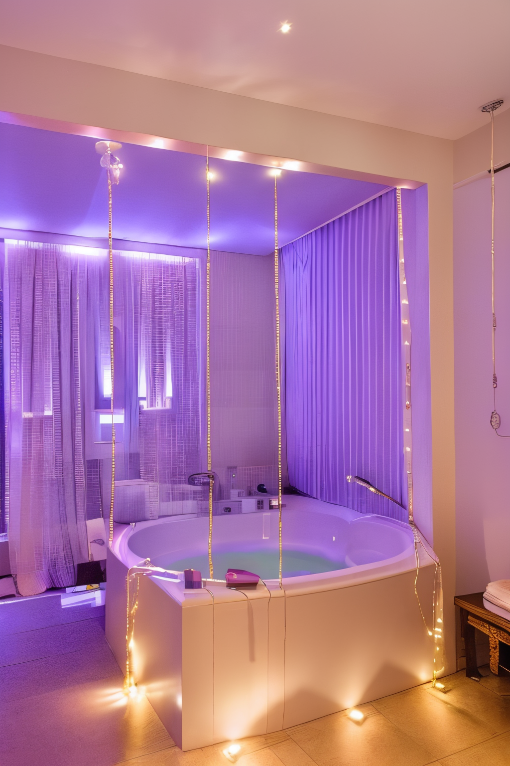 <lora:JJsLoveHotel:.7>,((Love Hotel)) , ,realistic, best quality, masterpiece , ((soft lighting)), heart, no humans, silk, bedroom, reflection,night, , light bulb, bed, pillow,bathtub, RAW photo, (high detailed), dslr, high quality, (ultra realistic), Fujifilm XT3,clubhouse, purple, ceiling light, <lora:add_detail:0.5>