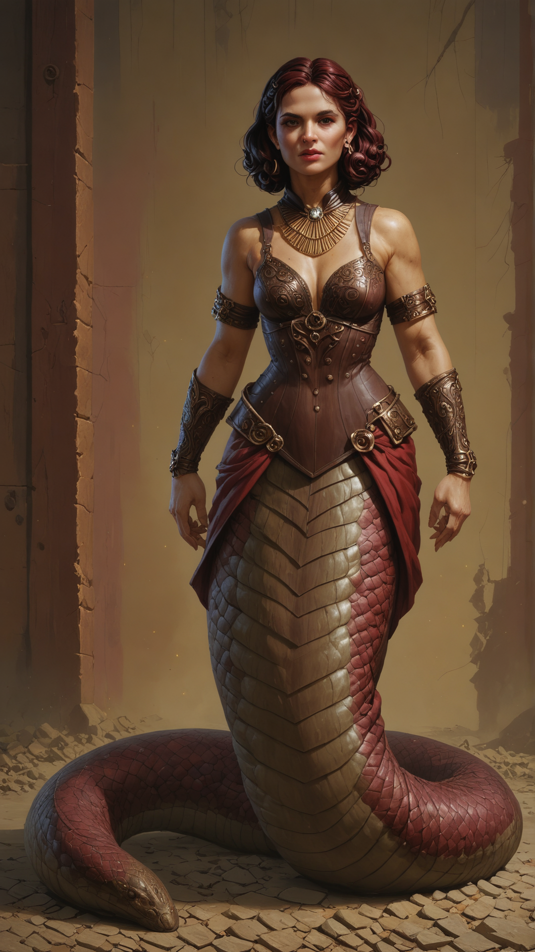 score_9, score_8_up, score_7_up, score_6_up, <lora:NagaPDXL:1>naga, full body, woman, burgundy twist-out in location: fortress, detailed background environment, daytime