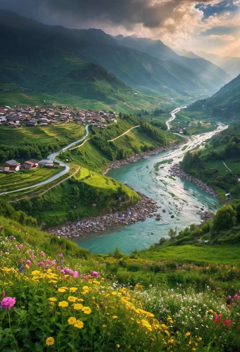 calm relaxing scenery, river, panoramic view, rain, wet, small village on the mountain cliff, lense flare, flower field, crystal clear, storm in the background, bokeh, OverallDetail, depth of field, detailed art, expressionism, extremely detailed, UHD,(long exposure )