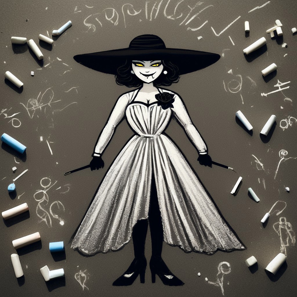 ch4lkdr4wing, chalk, dimitrescu, yellow eyes, blackhat, long white dress, cleavage, long Cigarette holder, long sleeves, black rose, black gloves, beads, jewelry black headwear, thick thighs, bow, black rose, beads, standing, sexy pose. smile fangs. black stockings, garters, garter belts, heels,
