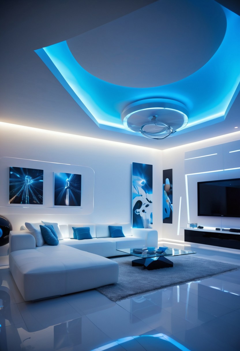 Arafed ceiling with a glass panel and white sofa, futuristic dramatic lighting, futuristic looking living room, futuristic interior, futuristic room, futuristic décor, volumetric interior lighting, dramatic white and blue lighting, stunning volumetric lighting, bright interior lighting, futuristic decoration, dramatic and dynamic lighting, white accent lighting, spectacular ambient lighting, award-winning interior design, illuminate, (pixar style, (epic:1.2), realistic, trending on artstation, 3d, (high quality:1.2), (masterpiece:1.2), high details), best quality, highres