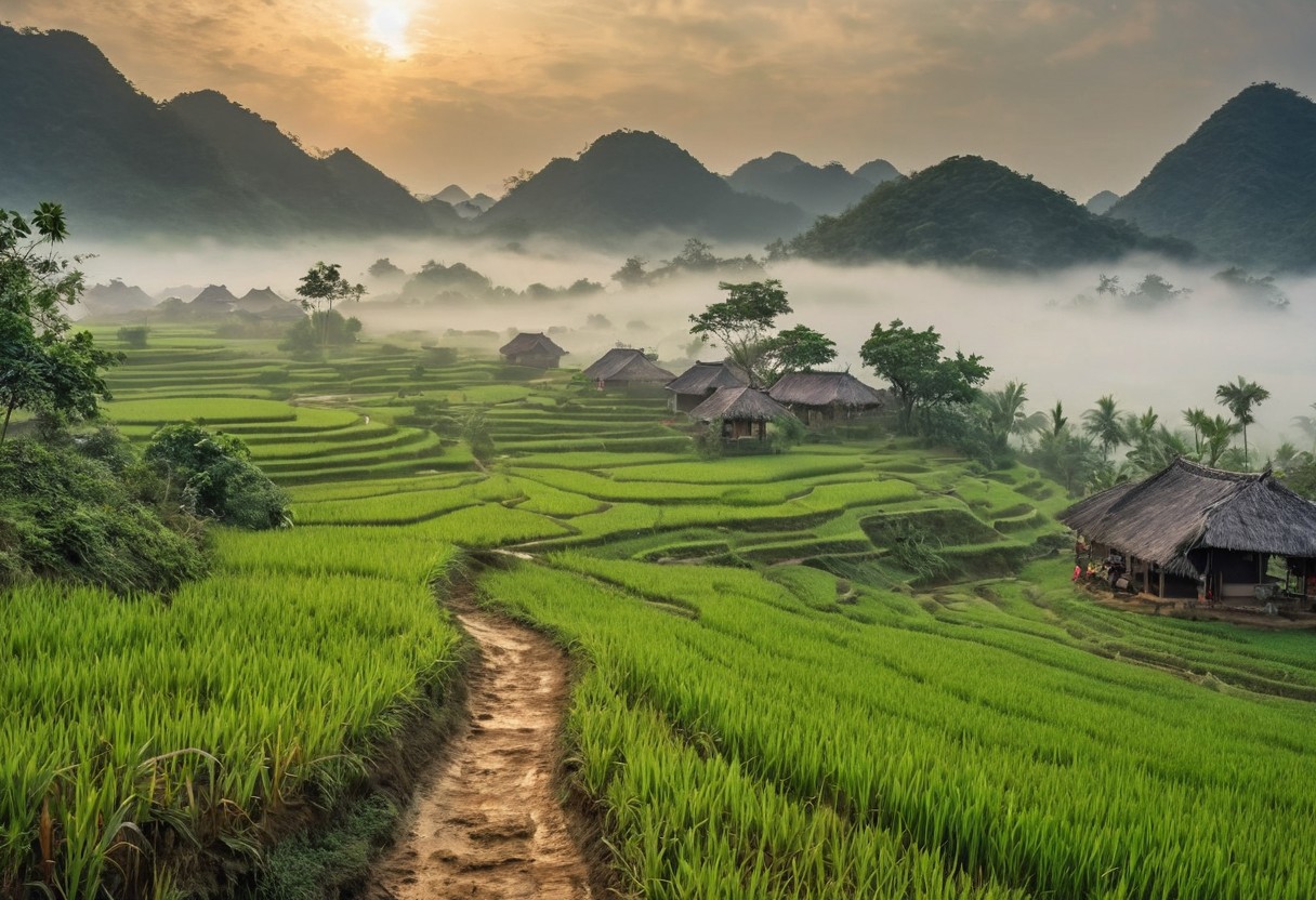 8k, breathtaking, Distance view from to rough footpath in the vietnamese village, small traditionnal Vietnam village,realistic, detailed mud, cloudy weather, morning lake mist, wet grass, sun rays, masterpiece, award-winning, professional, highly detailed, extremely detailed, UHD,(long exposure )