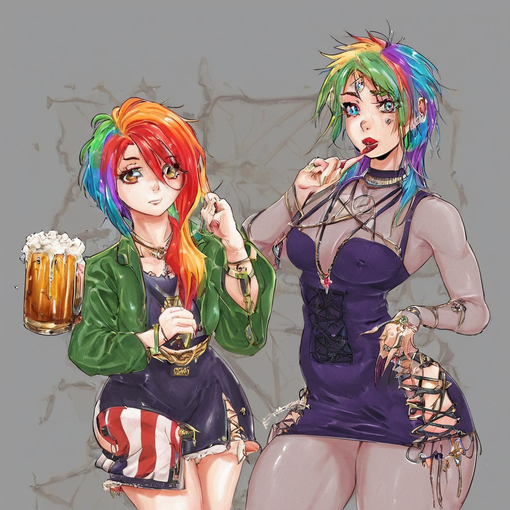 2 figures drinking red beer, a curvy female leprechaun, shemrock jewellery , ornate shillelagh, highly detailed, tight green jacket, short skirt, BREAK A beautiful wraith, translucent purple dress laced at front, rainbow hair, pentagram jewellery, long colourful finger nails,