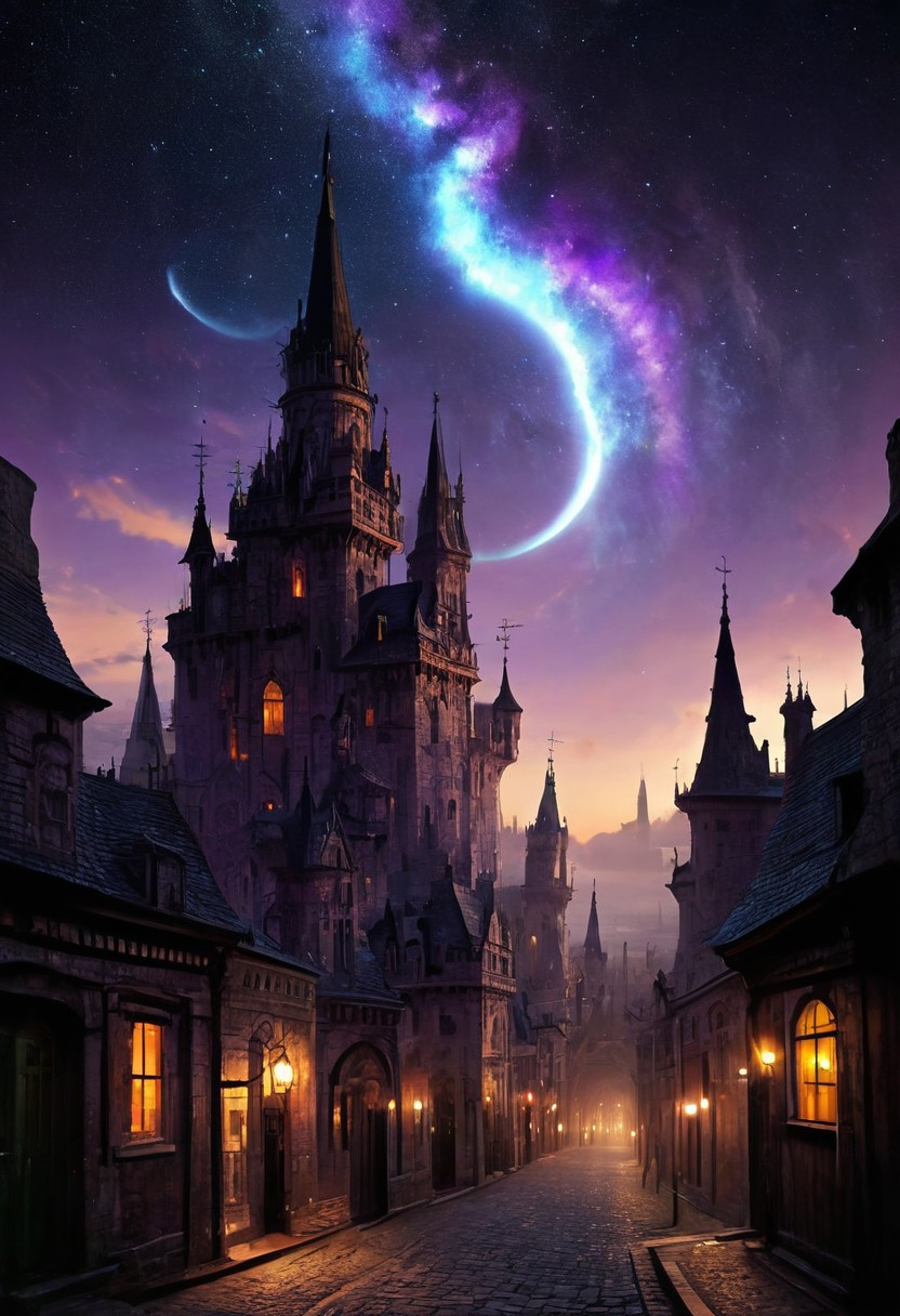 score_9, score_8_up, score_7_up, celestial promenade, the horror of stars, twilight sunshine, cityscape masterpiece, realistic, best quality, cosmic horror, Style-Volumetric, MJgothic, bright horror, s0lar, castle, blue and purple sky, city streets, spires, stone buildings