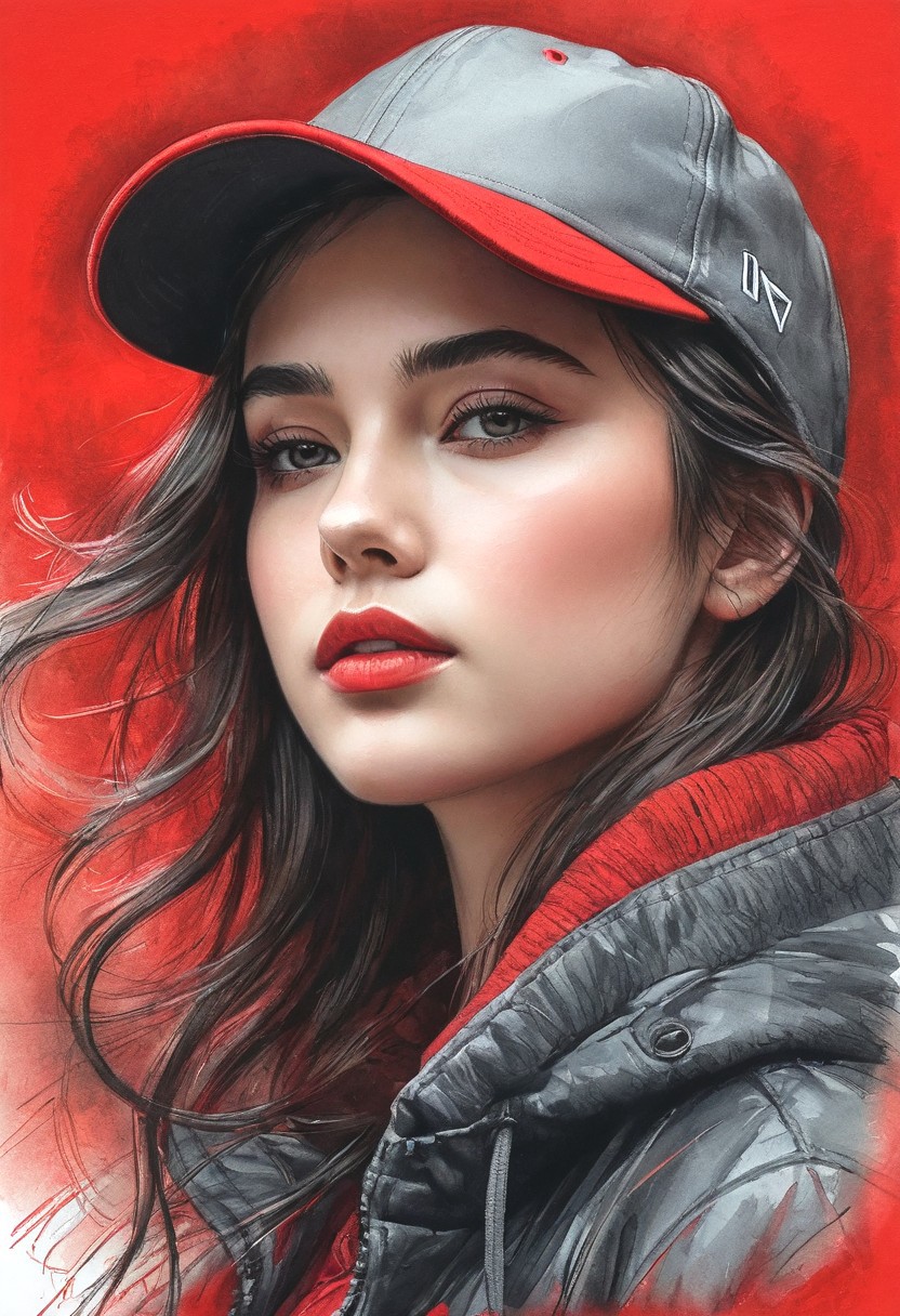 #Pastel, #drawing with dry chalk, #crayons on paper, #hatching with chalk, #drawing with chalk, #tinted paper, #drawing with colored chalk, Poster, sketch, close-up, sketch, fine lines and shading, Dark-haired girl with long, delicate strands wearing a red baseball cap and a red jacket, gazes despairingly downwards, strands of hair obscuring part of her face, contrasted by a soft sidelight highlighting her features, strands of hair, red cap, red jacket , downward gaze, ultra HD, realistic, vivid colors, highly detailed, UHD drawing, pen and ink, perfect composition, beautiful, detailed, intricate, insanely detailed art by Giovanni Boldini, Andrey Atroshenko, Tanya Shatseva, Ross Tran, Anna Razumovskaya, style-sylvamagic, Style-Autumn, style-sylvamagic, Style-Autumn,