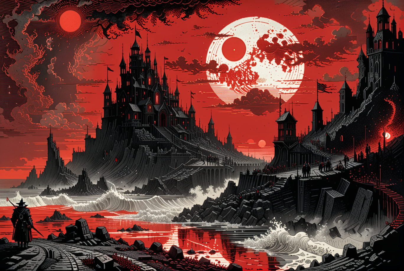 Gustave Doré Style page,woodcut illustration,masterpiece,ASCII,8k,absurdes,intricate,maximum resolution,dHe who has trod the shadows of Zothique, And looked upon the coal-red sun oblique, Henceforth returns to no anterior land, But haunts a later coast,<lora:Gustave Dore Style:1>,<lora:add-detail-xl:0.8>,<lora:d3p1x3lXLP:0.8>,d3p1x3l,pixel art,scenery,<lora:ArsMJStylePony_-_Pixel_Art:0.8>,ArsMJStylePony,Pixel Art,