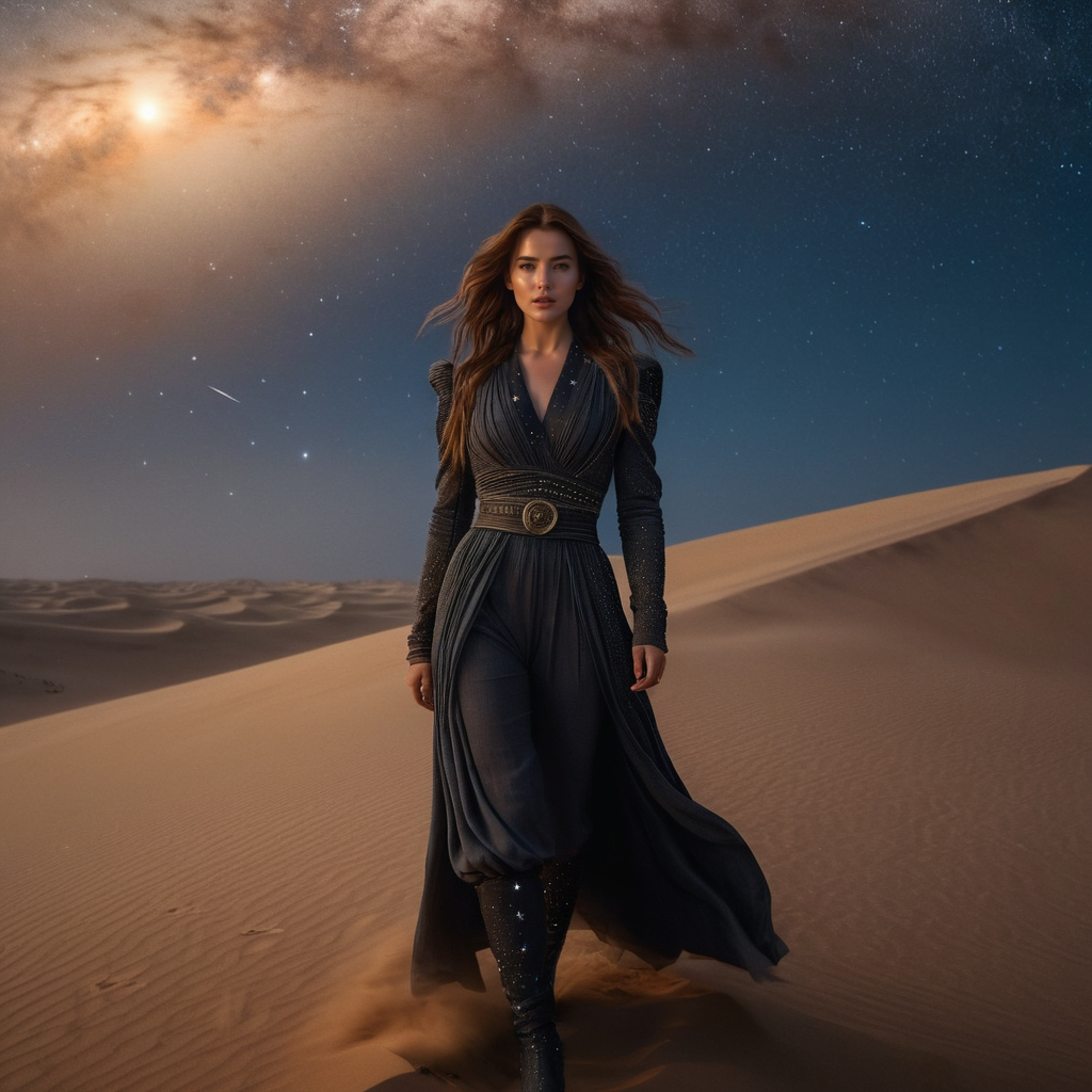 girl full-length photo, long hair, in clothes from the movie Dune, night dunes with a sky speckled with stars, a sandstorm is approaching in the background, hyper-realistic, 4k, cinematic, <lora:Coastal Dunes Photography:0.3> ,<lora:FDESIGN_Starry_Sky_SDXL:0.5> , <lora:FilmVelvia3:1>