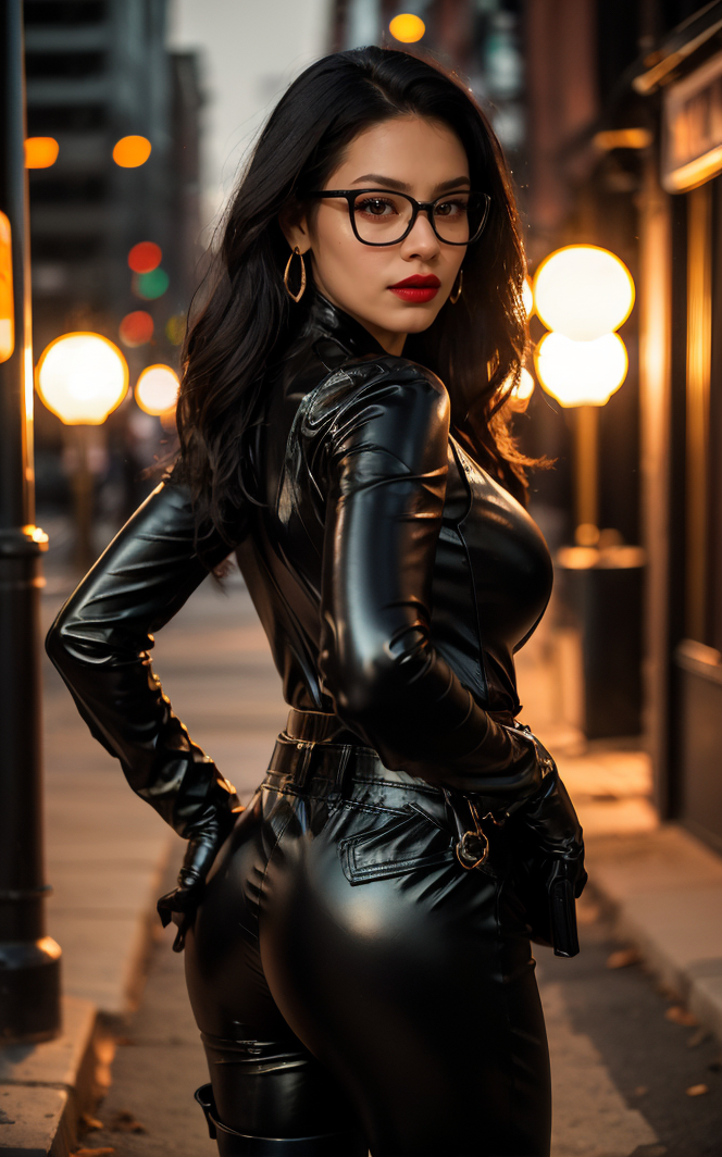((masterpiece, best quality)), insaneres, absurdres, solo, vanishing point, CosplayRealistic_Baroness_ownwaifu, 1girl, black hair, glasses, long hair, makeup, lipstick, lips, jewelry, earrings, large breasts, black-framed eyewear, brown eyes, red lips black bodysuit, realistic, snake print, black gloves, belt, holster, latex, leather, pants, outdoors, lens flare, depth of field, bokeh, embers, looking at viewer, (contrapposto, looking back)<lora:CARTOON_GIJoe_Baroness_ownwaifu:0.75>,