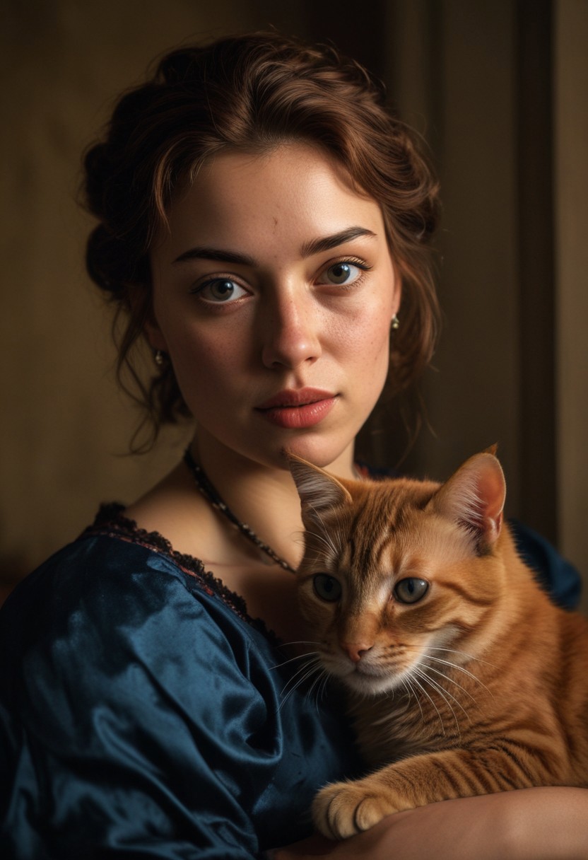 (((masterpiece, perfect Caravaggio's closeup portrait of a very beautiful girl, subtle smiling, with light skin imperfections and some freckles))). She's petting a cute red kitten on her laps. Inside an ancient noble Roman house of 1700 with rich furniture and curtains. Twilight warm and calm atmosphere. Precious blue colored fabrics for her elegant outfit. Wide angle lens, ((low angle shot)), ((full figure shot)), perfectly detailed scene, extreme realism. ((Carachters illuminated only by warm soft candle light, dark shadows)), artistic framing, low saturation, low contrast, ((soft focus)).
