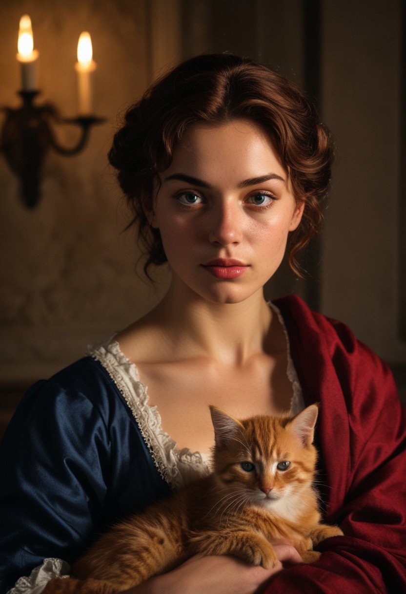 (((masterpiece, perfect Caravaggio's closeup portrait of a very beautiful girl, subtle smiling, with light skin imperfections and some freckles))). She's petting a cute red kitten on her laps. Inside an ancient noble Roman house of 1700 with rich furniture and curtains. Twilight warm and calm atmosphere. Precious blue colored fabrics for her elegant outfit. Wide angle lens, ((low angle shot)), ((full figure shot)), perfectly detailed scene, extreme realism. ((Carachters illuminated only by warm soft candle light, dark shadows)), artistic framing, low saturation, low contrast, ((soft focus)).
