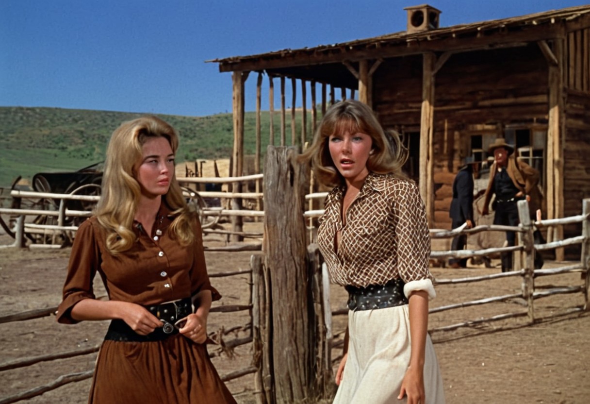 1960s Italian spaghetti western. Vibrant, action-packed scene set in a rustic, outdoor environment with a clear blue sky and scattered clouds. The layout features two women engaged in a physical altercation. The woman on the left, with long blonde hair, is wearing a light brown dress with black buttons and appears to be recoiling from a hit. The woman on the right, with wavy brown hair, is wearing a dark brown cowboy hat, a patterned brown blouse with a deep neckline, and a white undershirt. The background includes a wooden building, a fence, and a wagon wheel, suggesting a Western setting. The overall composition captures the intensity and movement of the moment.