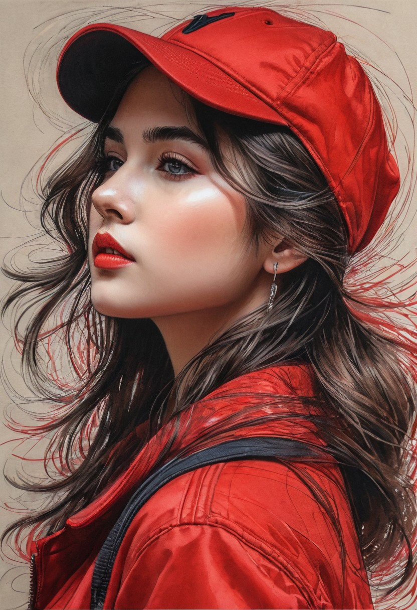 #Pastel, #drawing with dry chalk, #crayons on paper, #hatching with chalk, #drawing with chalk, #tinted paper, #drawing with colored chalk, Poster, sketch, close-up, sketch, fine lines and shading, Dark-haired girl with long, delicate strands wearing a red baseball cap and a red jacket, gazes despairingly downwards, strands of hair obscuring part of her face, contrasted by a soft sidelight highlighting her features, strands of hair, red cap, red jacket , downward gaze, ultra HD, realistic, vivid colors, highly detailed, UHD drawing, pen and ink, perfect composition, beautiful, detailed, intricate, insanely detailed art by Giovanni Boldini, Andrey Atroshenko, Tanya Shatseva, Ross Tran, Anna Razumovskaya, style-sylvamagic, Style-Autumn, style-sylvamagic, Style-Autumn,