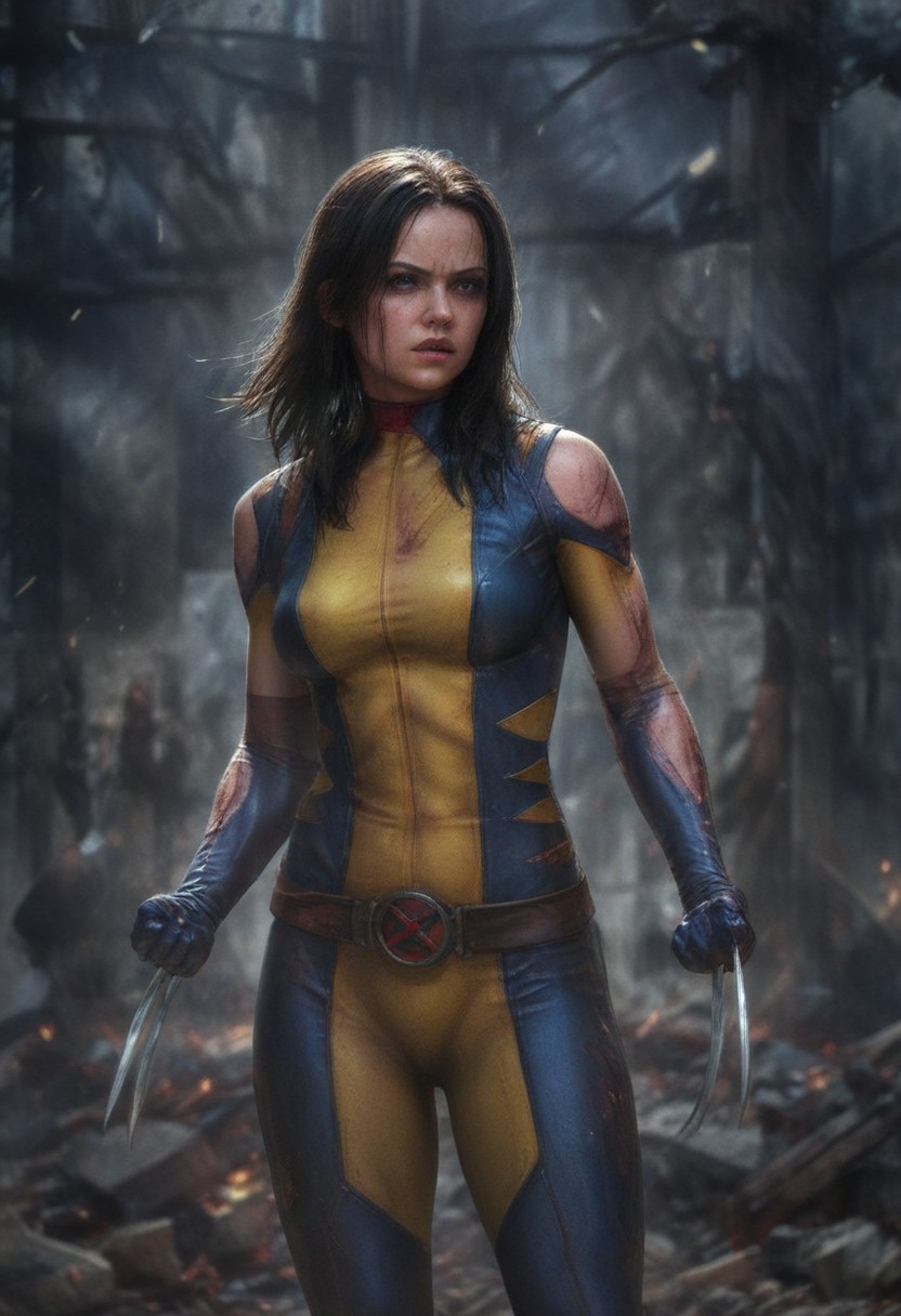 High resolution ultra-realistic of Beautiful Laura Kinney/X-23, cinematic lighting, MCU style, ultra realistic, 8K, fighting stance, X-Men style, standing among the ruins of buildings, Greg Rutkowski, Intricately Designed bloody dirty face, wavy black hair, Realistic beautiful brown eyes, gazing straight ahead, Atrractive 21 years old Dafne Keen as X-23 woman, realistic modern combat X-Men costume, dirty, bloody, beautiful firm Breasts, defiant and seductive, X-Men style, Marvel style, MCU sci-fi style, Superheroine, Standing in the middle of a dark dirty street on the City, sharp focus, digital painting, Photograph Taken on Nikon D750, Alphonse Mucha, 8K, athletic figure, Hyperdetailed, hyperrealism, aesthetics reminiscent of X-Men, Attractive, Attractive bust girl, asymmetric balance