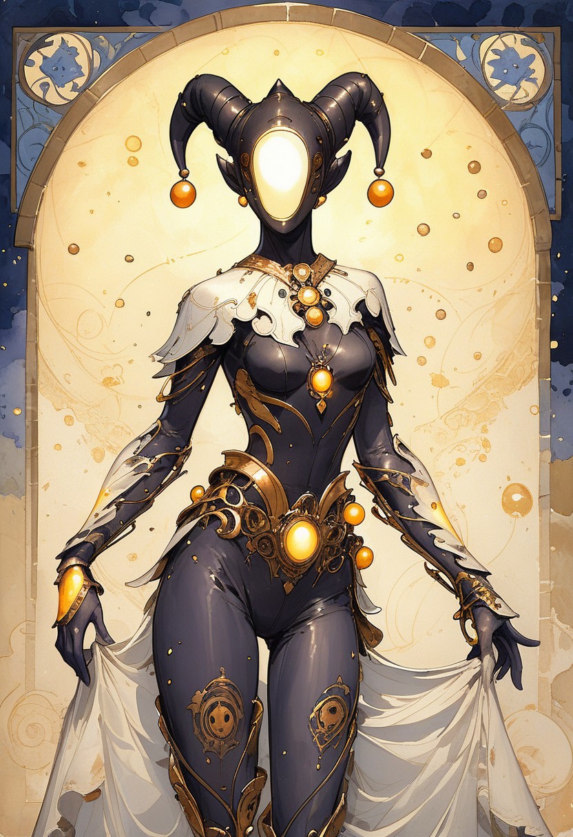 score_9, score_8_up, score_7_up, In a bleak and barren world, jester woman dancing and juggling, juggling with skulls, summer festival, wild dance kicking and flailing, radiating mirth, strange woman, big eyes, dark blue skin, white eyes, golden jewelry, overburdened with cheap jewelry,,1girl, ArsMJStyle, art nouveau, , the scene is captured in dimly lit dark fantasy but vibrant colors, with bold ink lines defining form against the watercolor wash of the aged paper (Art Noveau), ArsMJStyle, Drawn in the style of a tarot card, glowing neon purple trim, gold trim, skin tight outfit, revealing outfit, sexy