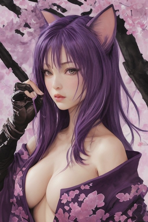 ninja woman warrior, purple eyes, pink cat ears, cleavage, Sakura bloom, watercolor, ink drips, isolated on parchment,