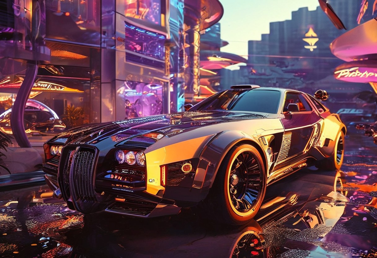 ((70's retrofutursim with Syd Mead art style)), psychedelic world 70's collide with a futuristic vision. a fusion of Vasarely art, Bertone concept vehicles, and sleek architecture, iconic art style of Syd Mead. blend of retro aesthetics and futuristic utopia, monocoque monorail, a unique realm that is both nostalgic and visionary, futuristic flying car, Blade Runner spinner, evening violet light, sunset, fountains, glowing windows, 1woman, Playboy playmate in bikini