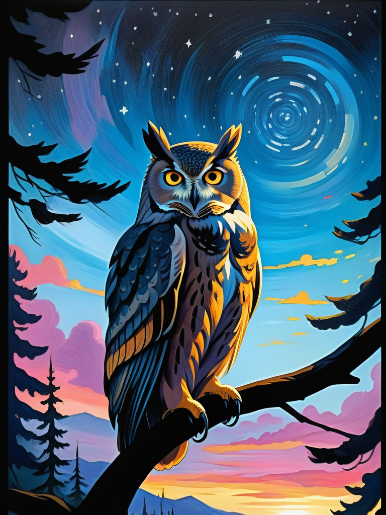<lora:NatureLandscapePainting01_Hap_XL:2.8>, <lora:add-detail-xl:0.3>, nature,serene,oil painting,brushstrokes painting,illustration,impressionistic,visual depth, glowing frame, backlight colors, silhouette colors, cosmic frame, powerful owl, profile in a frame, silhouette, backlighting, vibrant,magical night sky, illustration, soft, beautiful, dreamy, realistic, professional, simple, twinkling night sky, extremely detailed, hyper detailed, illustration, half finished sketch, half colored sketch, anime, masterpiece, bright colors, high contrast, vivid lighting, dark background, simple background, mad-spiral-galaxy,