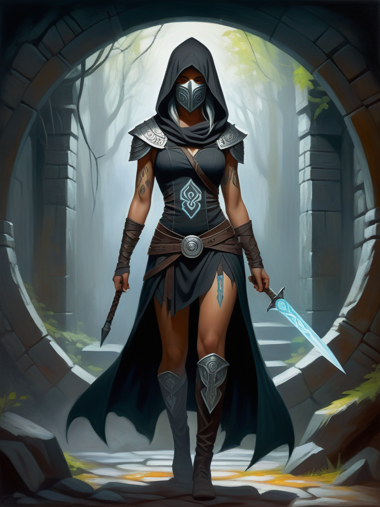 <lora:NatureLandscapePainting01_Hap_XL:2.8>, <lora:add-detail-xl:0.3>, nature,serene,oil painting,brushstrokes painting,illustration,impressionistic,visual depth, Digital painting. Full body. In a dark fantasy dungeon, a mysterious female , muscular, dark canvas clothes, canvas hood, war mask, silver ornaments. Runic tattoos. Mystic power. glowing eyes. Power Runic circle. Dimensional portal. Sensual and dangerous. ais-darkpartz. colorful. DarkFantasy