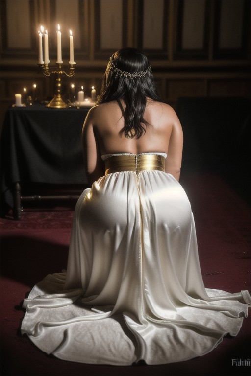 RAW photo, 8k uhd, dslr, high quality, ultra-realistic, realistic, realism, film grain, Fujifilm XT3. View from behind, dark gothic-room lit by candles•ancient stone alter•(golden chalice)•(blood spilling out). 1woman wearing a (satin white dress)•voluptuous body•kneeling•worshiping