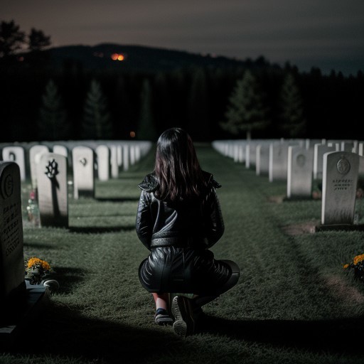 RAW photo, 8k uhd, dslr, high quality, film grain, Fujifilm XT3. View from behind, dim horror movie lighting, 1woman, kneeling in front of grave