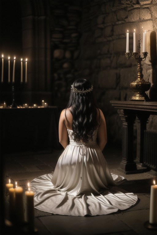 RAW photo, 8k uhd, dslr, high quality, ultra-realistic, realistic, realism, film grain, Fujifilm XT3. View from behind, dark gothic-room lit by candles•ancient stone alter•golden chalice•blood spilling out. 1woman wearing a (satin white dress)•voluptuous body•kneeling•worshiping