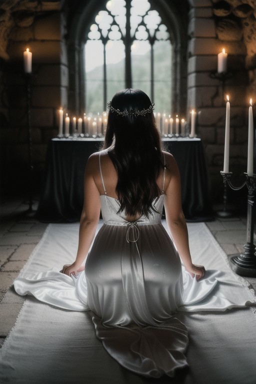 RAW photo, 8k uhd, dslr, high quality, ultra-realistic, realistic, realism, film grain, Fujifilm XT3. View from behind, dark gothic-room lit by candles•ancient stone alter. 1woman•wearing a (satin white dress)•voluptuous body•kneeling•worshiping
