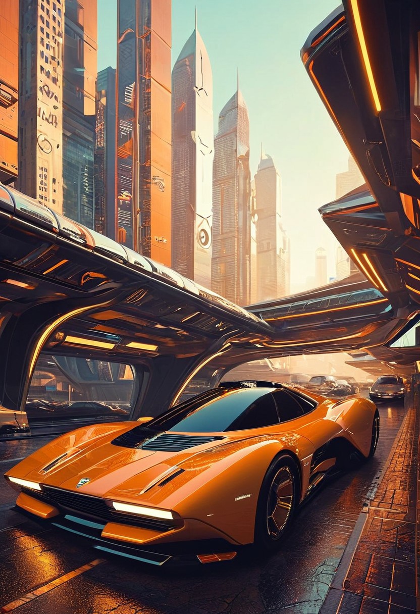 ((70's retrofutursim with Syd Mead art style)), psychedelic world 70's collide with a futuristic vision. a fusion of Vasarely art, Bertone concept vehicles, and sleek architecture, iconic art style of Syd Mead. blend of retro aesthetics and futuristic utopia, monocoque monorail, a unique realm that is both nostalgic and visionary, futuristic flying car, Blade Runner spinner