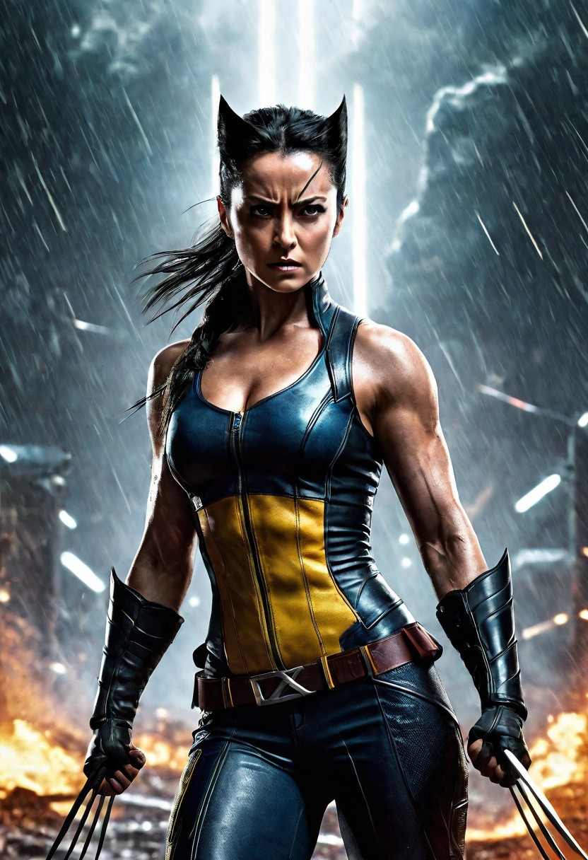 High resolution ultra-realistic of Beautiful Wolverine/Logan vs Laura Kinney/X-23, cinematic lighting, Marvel style, Wolverine and X-23 stand side by side in battle pose on a bloody and stormy battlefield, 8k, realistic modern Wolverine X-Men yellow and black combat costume, gazing straight ahead, dirty face, full body, ultra realistic, cinematic style, athletic figure, day lighting, sharp focus, digital painting, Photograph Taken on Nikon D750, Alphonse Mucha, Hyperdetailed, hyperrealism, aesthetics reminiscent of X-Men, Attractive, asymmetric balance