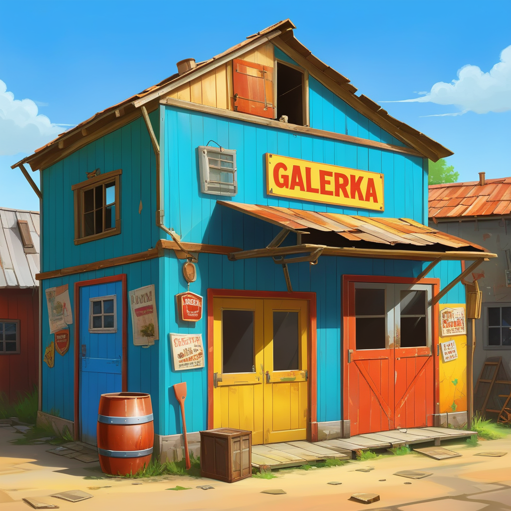 masterpiece,(cartoon style), <lora:CartoonStyle_Hap_XL:1.6>, Illustration of a ramshackle garage transformed into the vibrant hub of 'Galerka Games', operation boasts a weather-beaten edifice with patched walls under a burdened roof, main sign, a rusty testament hanging lopsided, boldly declaring 'Galerka Games', asymmetrical windows reveal the battlefield of creativity, a home crafted 'Open/Closed' sign in a tilted dance on the quirkyï¼
