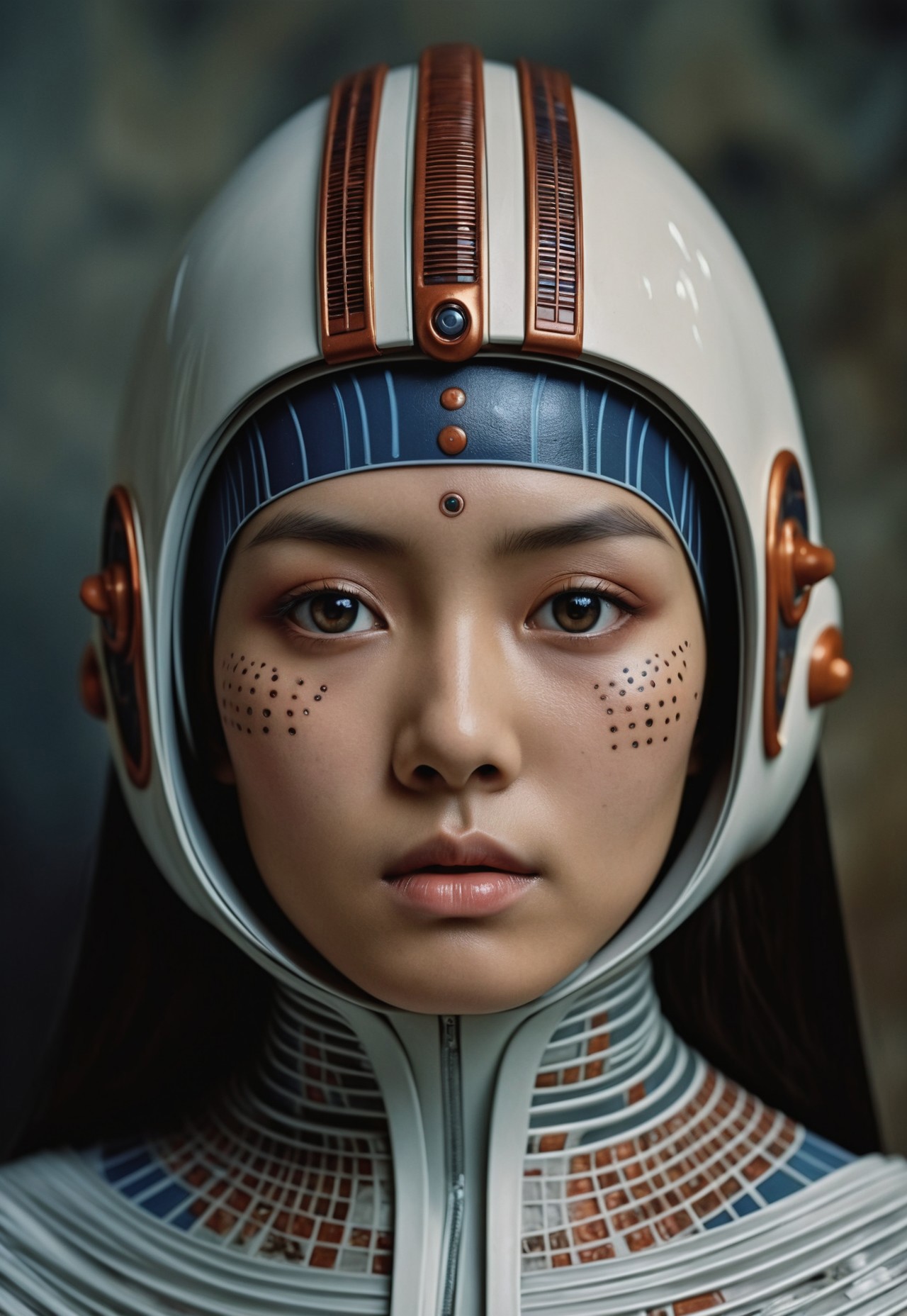 35mm photo by Steve McCurry, futuristic future setting, japanese woman, stunning asian woman, ultra-detailed skin, detailed eyes with intricate pupils, advanced futuristic clothing, intense and captivating expression, top-quality resolution