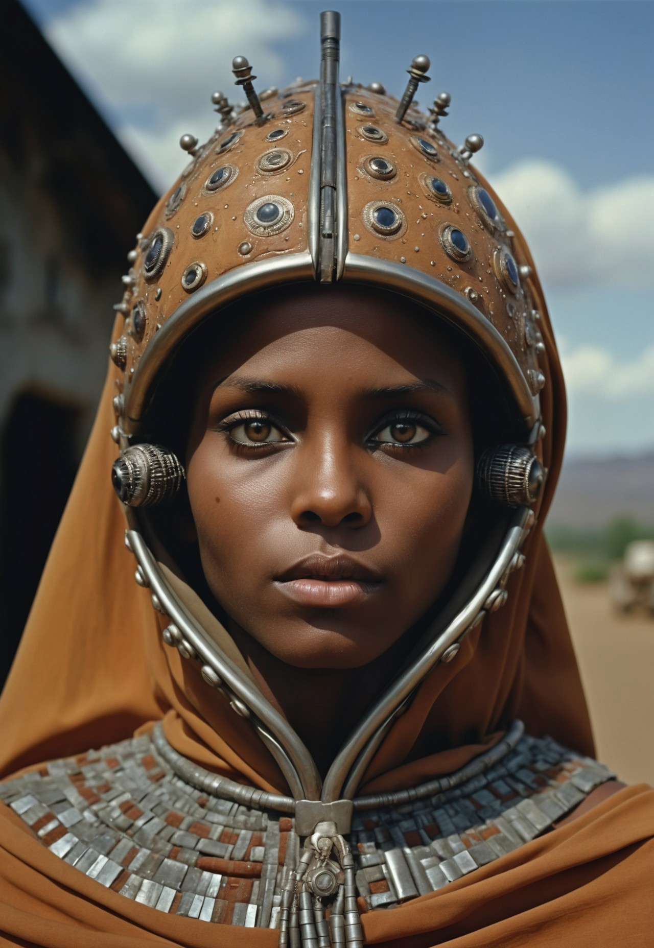 35mm photo by Steve McCurry, futuristic future setting, stunning Tanzanian woman, ultra-detailed skin, detailed eyes with intricate pupils, advanced futuristic clothing, intense and captivating expression, top-quality resolution