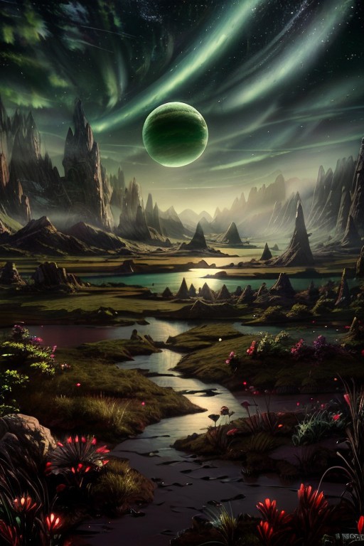 masterpiece, best quality, Rocky mountains stretch upwards in thin peaks into the greenish sky of an alien planet, at the foot of the mountains greenish snow is visible, in the foreground there is a small lake with muddy water, above the lake there is a light greenish haze. A gas giant planet is visible in the sky, Matte painting, artstation, 4k, high resolution, (masterpiece:1.2), best quality