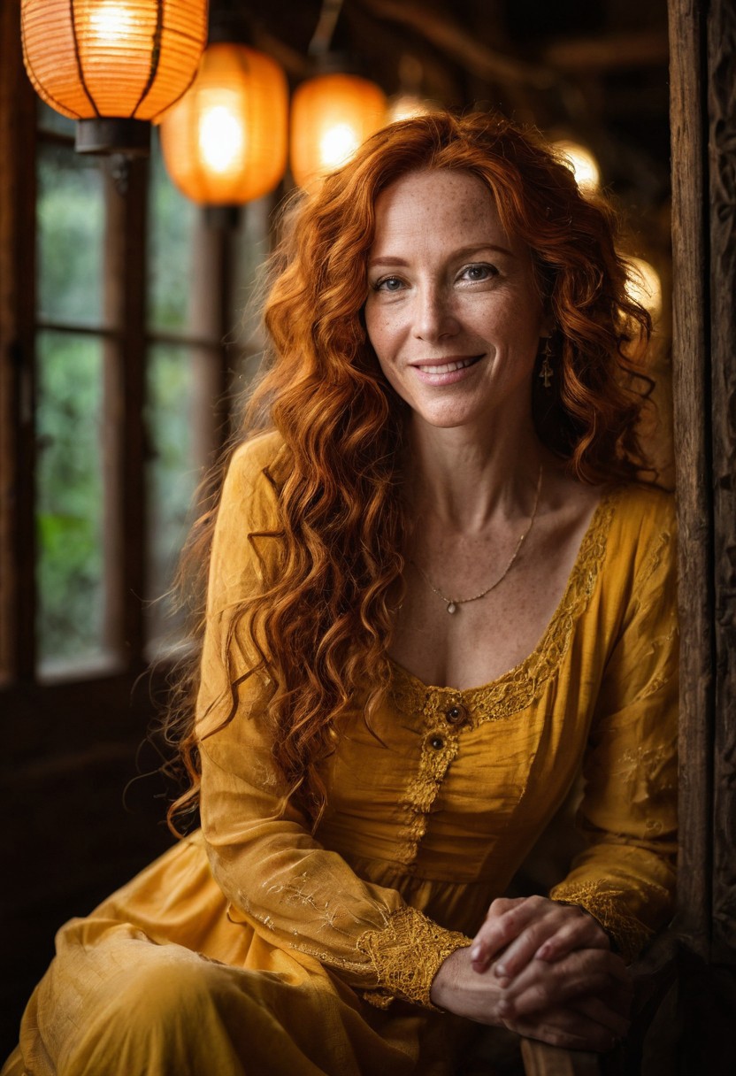 A night time photo of a beautiful woman, (50 years old:1.5), with long curly orange hair and freckles, pleasant smile, wearing a bright yellow dress, jewelry, sitting, skinny, narrow hips, slim petite body, (medium breasts:1.3), sitting inside a cozy medieval cottage, (perfect hands:1.5), (cinematic), (dark, high contrast), (intricately detailed eyes:1.5), (subsurface scattering:0.9) lit by Victorian lanterns, full body view. shallow depth of field, vignette, highly detailed, high budget, bokeh, cinemascope, moody, epic, gorgeous, film grain, grainy, dark shadows, DarkFantasy, photo, cinematic,