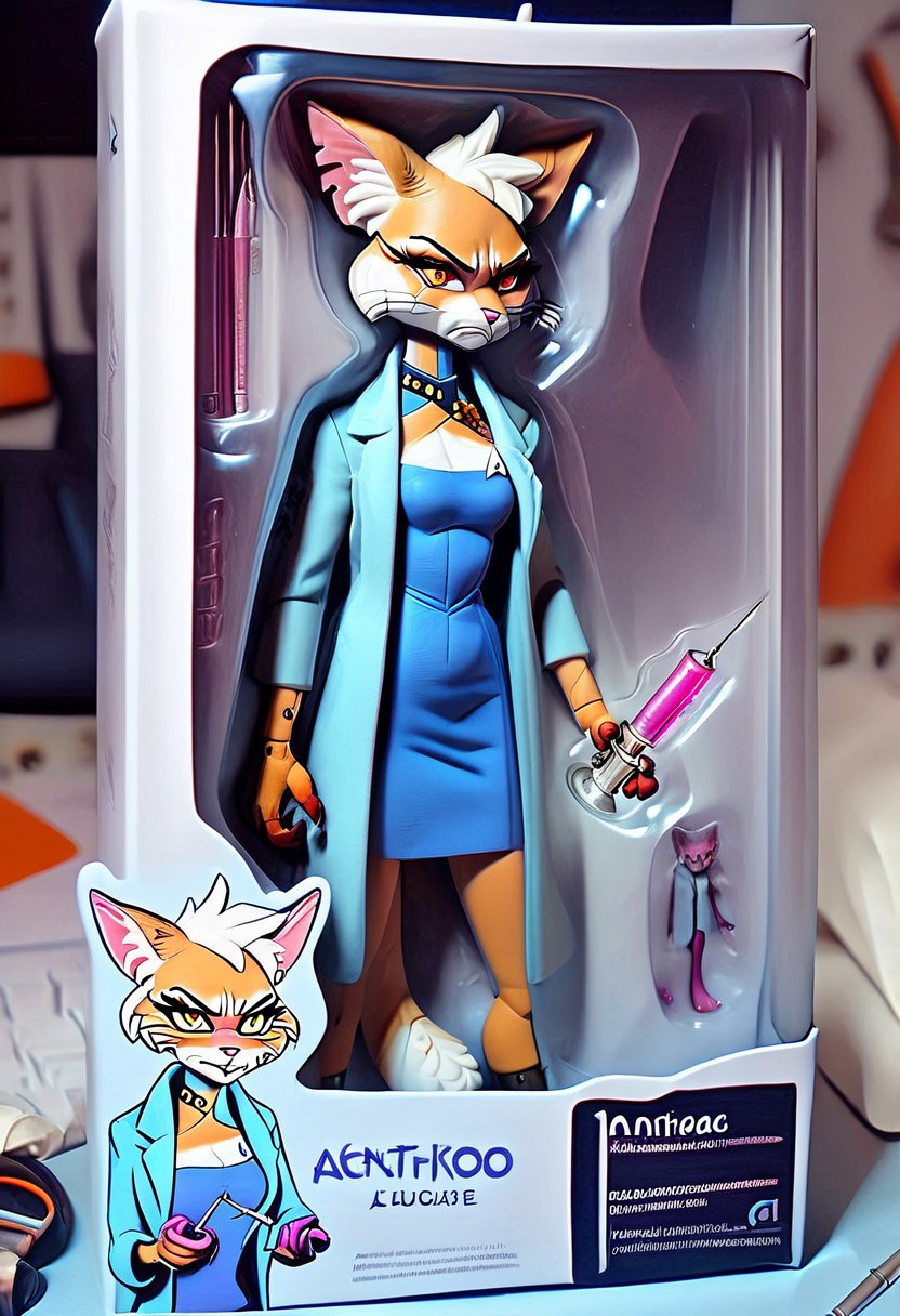 score_9, score_8_up, score_8, act10nf1gure, toy packaging, action figure, t4n4,1girl, furry, lab coat, english text, holding syringe