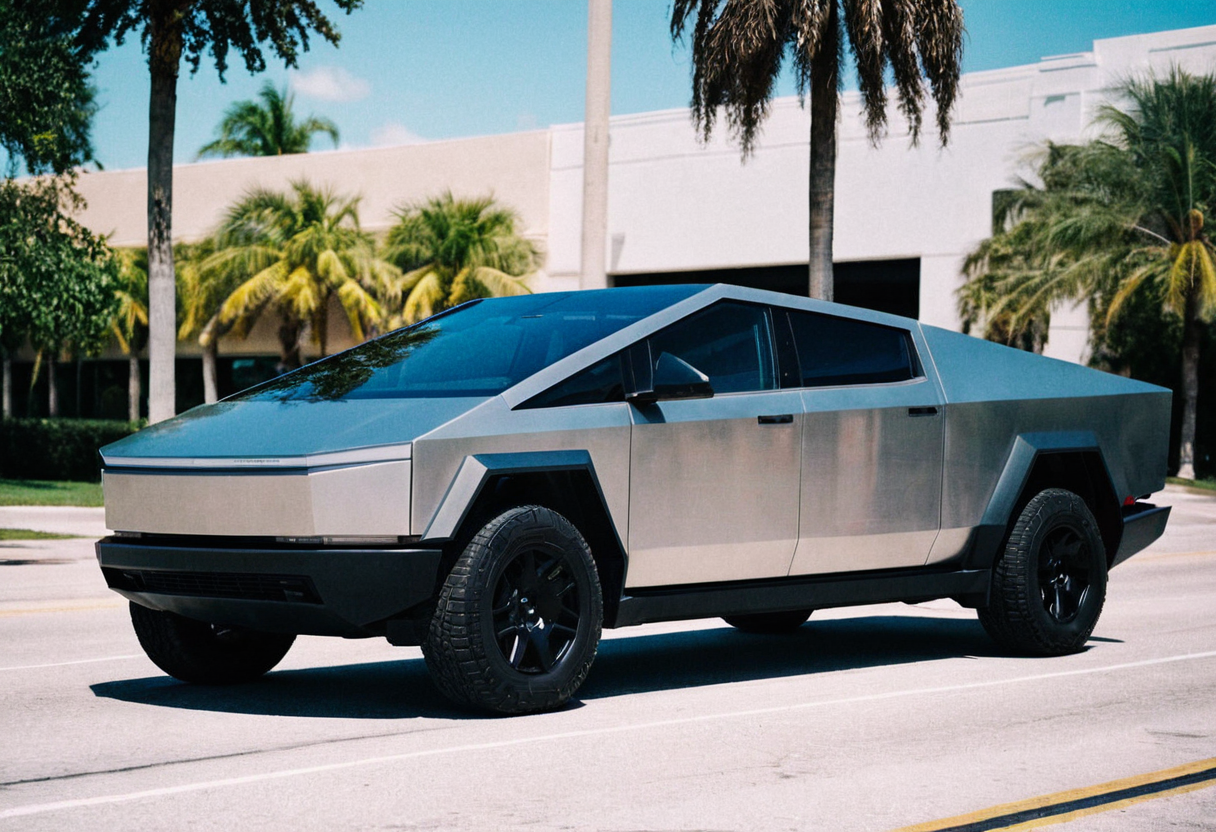 cybertruck gleaming, side front view, sunny Miami avenue, palm trees, 4K, highly detailed, stylish grainy analog 35mm film photo