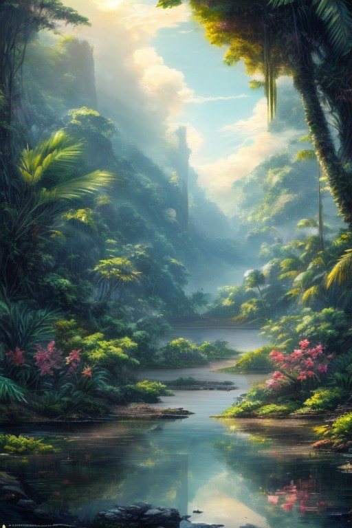 extremely detailed, deep tropical forest on shore big river, humid air, water as mirror, day, shihing, white clouds,