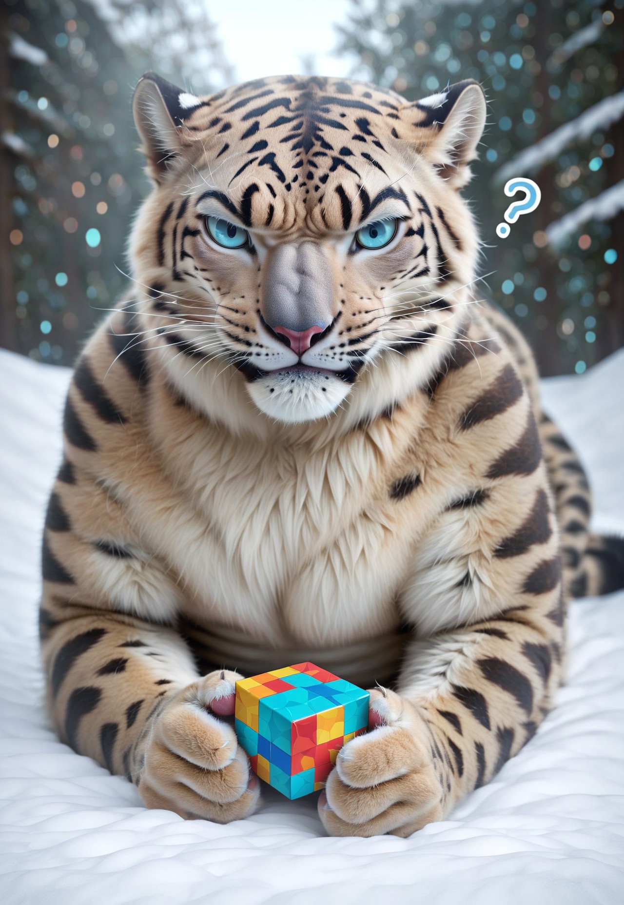 score_9, score_8_up, score_7_up, score_6_up, score_5_up, score_4_up, source_anime, no humans, hud_sn0w_le0pard, solo, tiger, cat, blue eyes, whiskers, outdoors, lying, on stomach, looking down, snow, holding, holding rubik's cube, shrugging, confused, angry, question mark. 35mm photograph, film, bokeh, professional, 4k, highly detailed, clenched hands, frustrated, anger vein