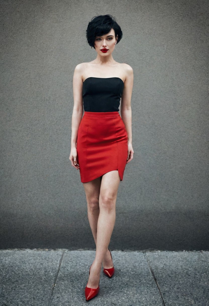 photograph by natalia drepina. woman, , (fullbody Portrait:1.3), red_manicure, red_lipstick, black hair, pixie cut, nipples exposed, hard nipples. ankles. red stilettos. epiCPhoto. intricate background. outdoor. hat