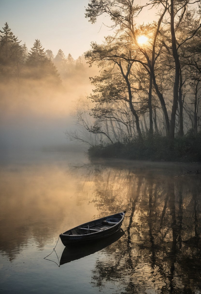 striking details. "Sunset Serenity: In the embrace of dusk, a distant landscape emerges from the mist, framed by towering trees lining the river stream. Captured through the lens of a camera, the scene is bathed in the warm hues of sunset, with sun rays filtering through the foliage, casting enchanting shadows. A lone fisherman's boat peacefully floats in the middle of the mist-covered lake, adding a touch of tranquility to the ethereal layers. Exif data reveals a wide-angle lens set at 24mm, an aperture of f/4.5, and a shutter speed of 1/80 seconds, freezing this serene tableau in time